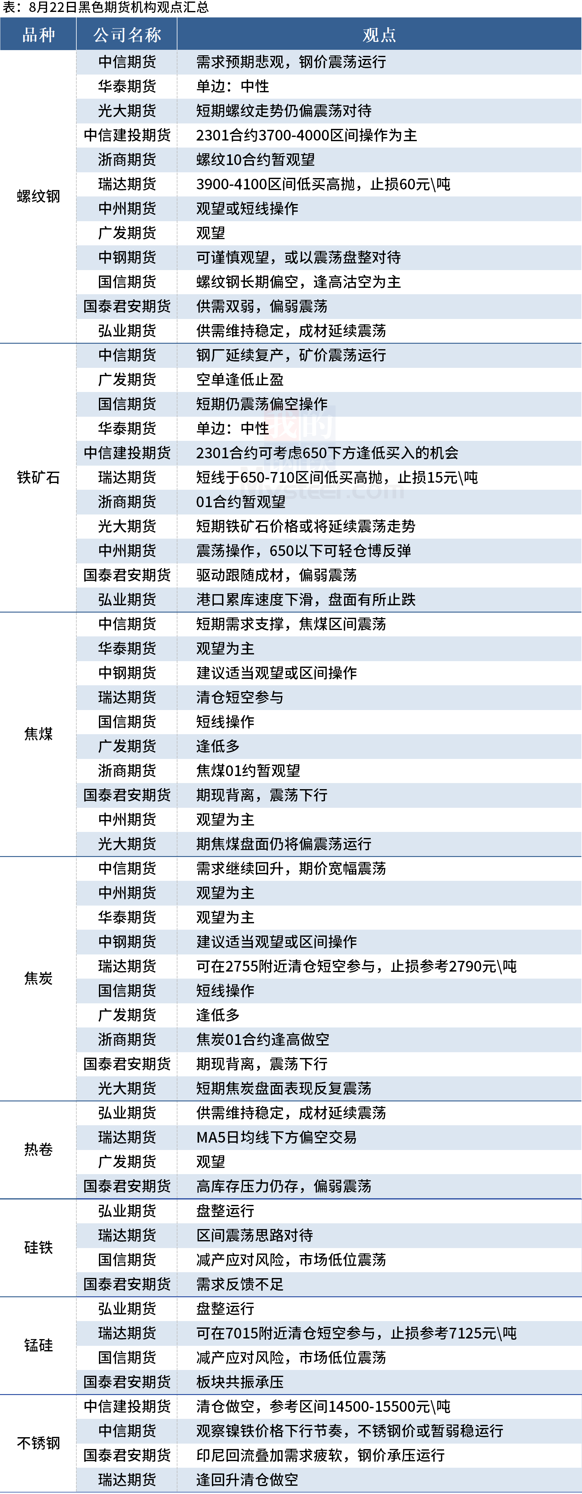 據Mysteel統(tǒng)計8月22日12家期貨機構操作策略,其中多數(shù)機構料螺紋鋼震蕩運行,建議鐵礦石震蕩偏弱,焦煤、焦炭暫觀望。具體匯總內容如下: